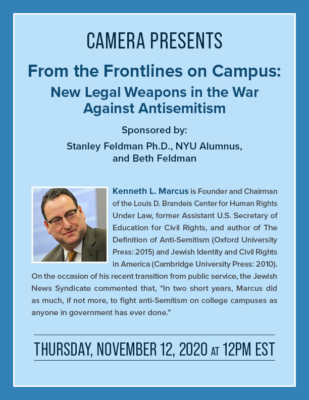 CAMERA presents Kenneth L. Marcus, Founder and Chairman at the Brandeis Center, this Thursday, November 12 at noon / 12 pm (Eastern) to discuss new legal weapons on the war against anti-semitism on campus. For the CAMERA flyer, click here. To register, click here.