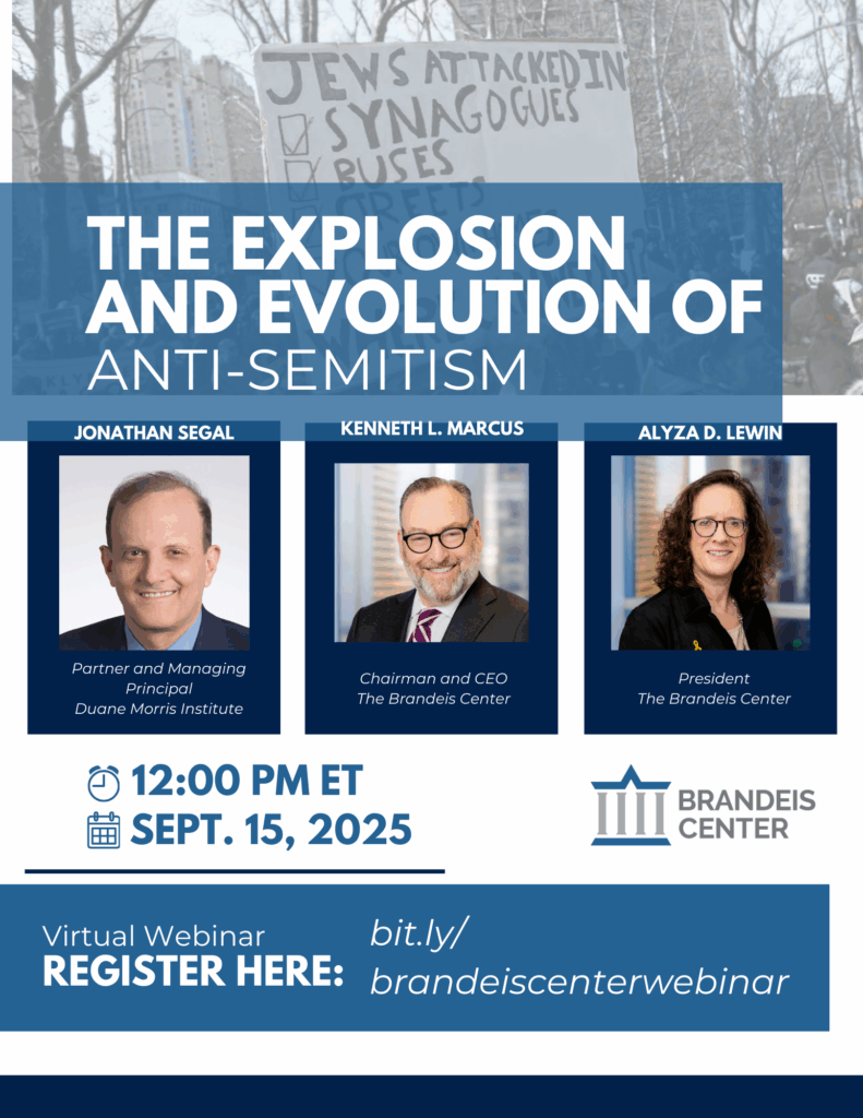 REGISTER HERE FOR THE WEBINAR In recent years, the United States has seen a record number of incidents of anti-Semitic harassment, vandalism, and assault. Further, although Jews account for only 2% of the U.S. population, 15% of all hate crimes target Jews, according to the FBI. Individuals don’t park their hate at the workplace door. Some of the hate (and lesser bias) inevitably cascades into the workplace. Acting EEOC Chair Andrea Lucas has stated publicly that addressing anti-Semitism is among her top priorities. But many employers have not yet infused combating anti-Semitism into their compliance policies and practices, including training. This creates material legal exposure. In this program, Brandeis Center leaders Kenneth Marcus and Alyza Lewin, and attorney Jonathan Segal, will discuss examples of anti-Semitic discrimination and harassment that can occur in the workplace and steps employers should take to prevent and respond to them.